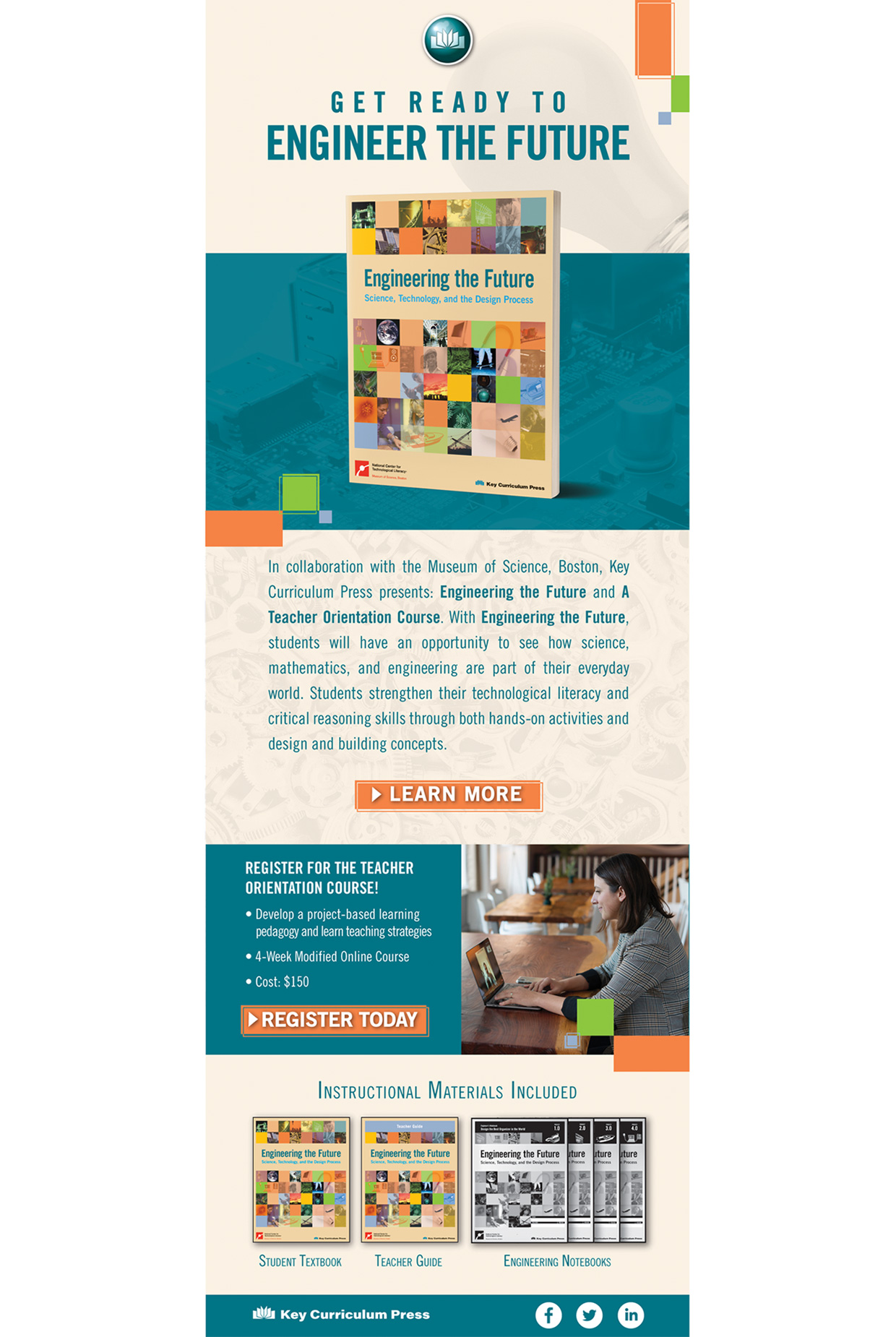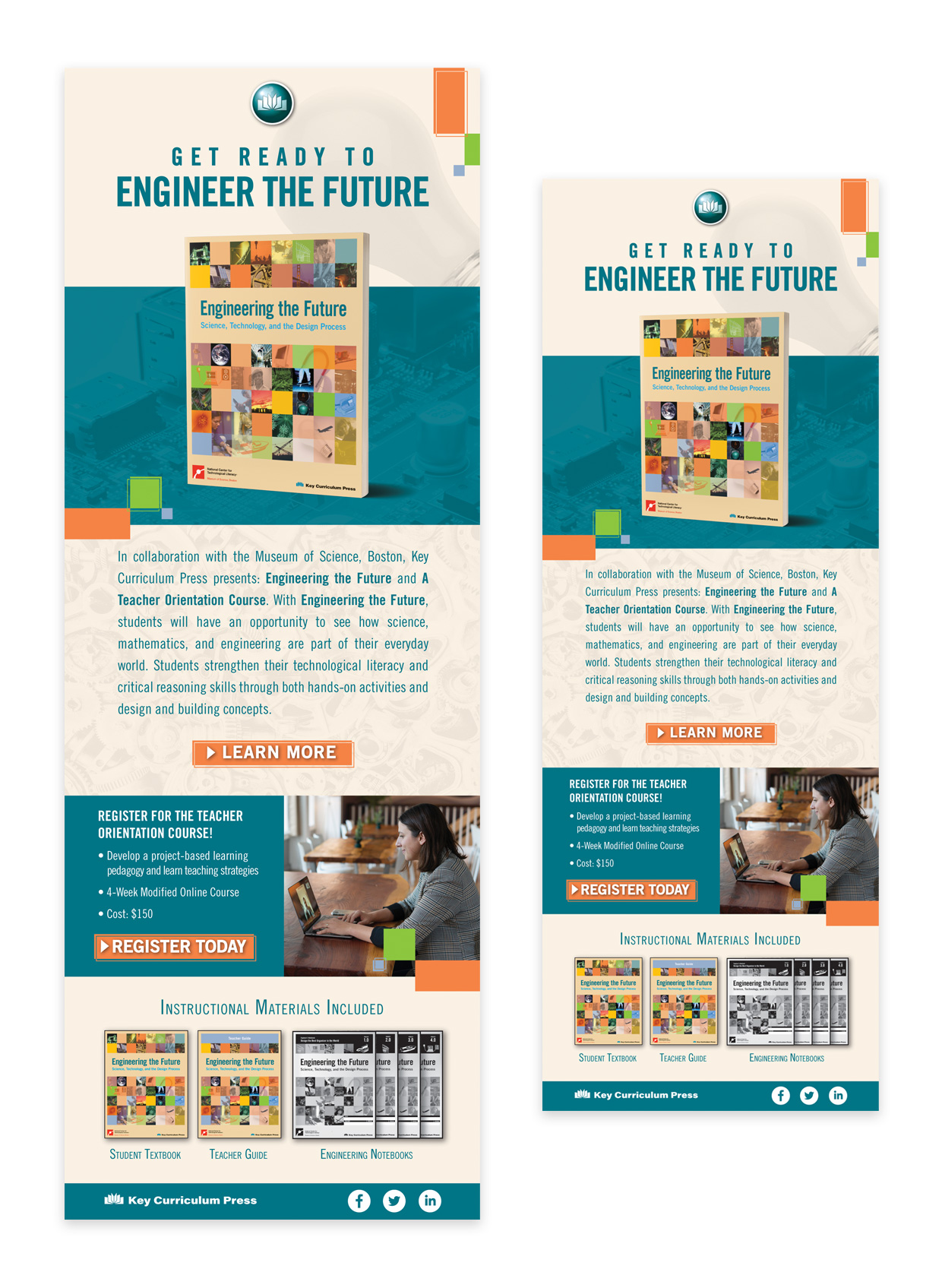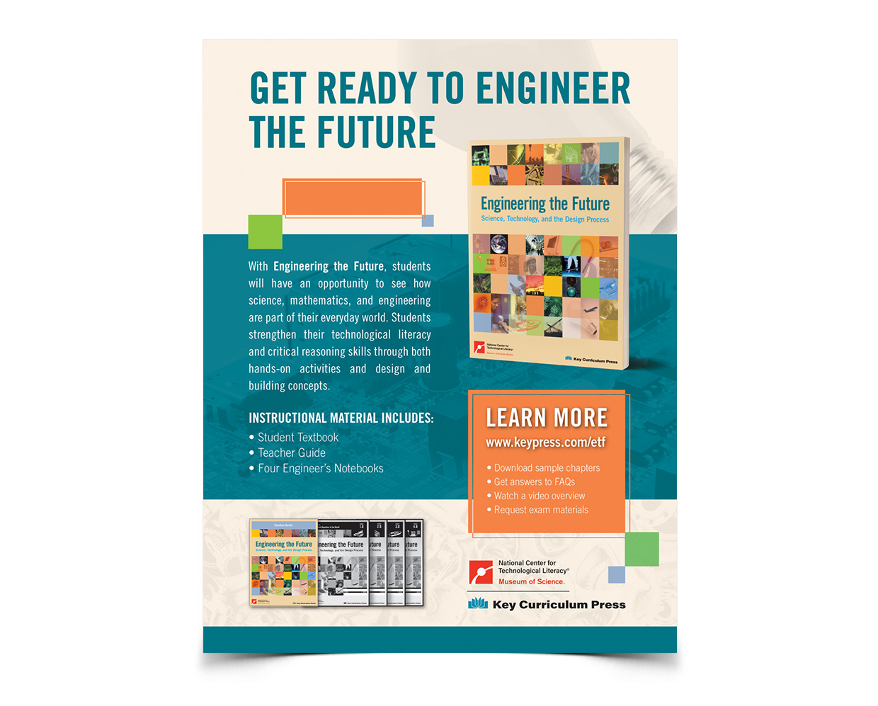 With a close collaboration with the Museum of Science, Key Curriculum Press wanted to promote and present the Engineering the Future textbook and the Teacher Orientation Course to teaching professionals. Working closely with marketing team members and education consultants, it was agreed that a flyer to be mailed out and a follow up email would be best to reach out to teachers and school institutions.