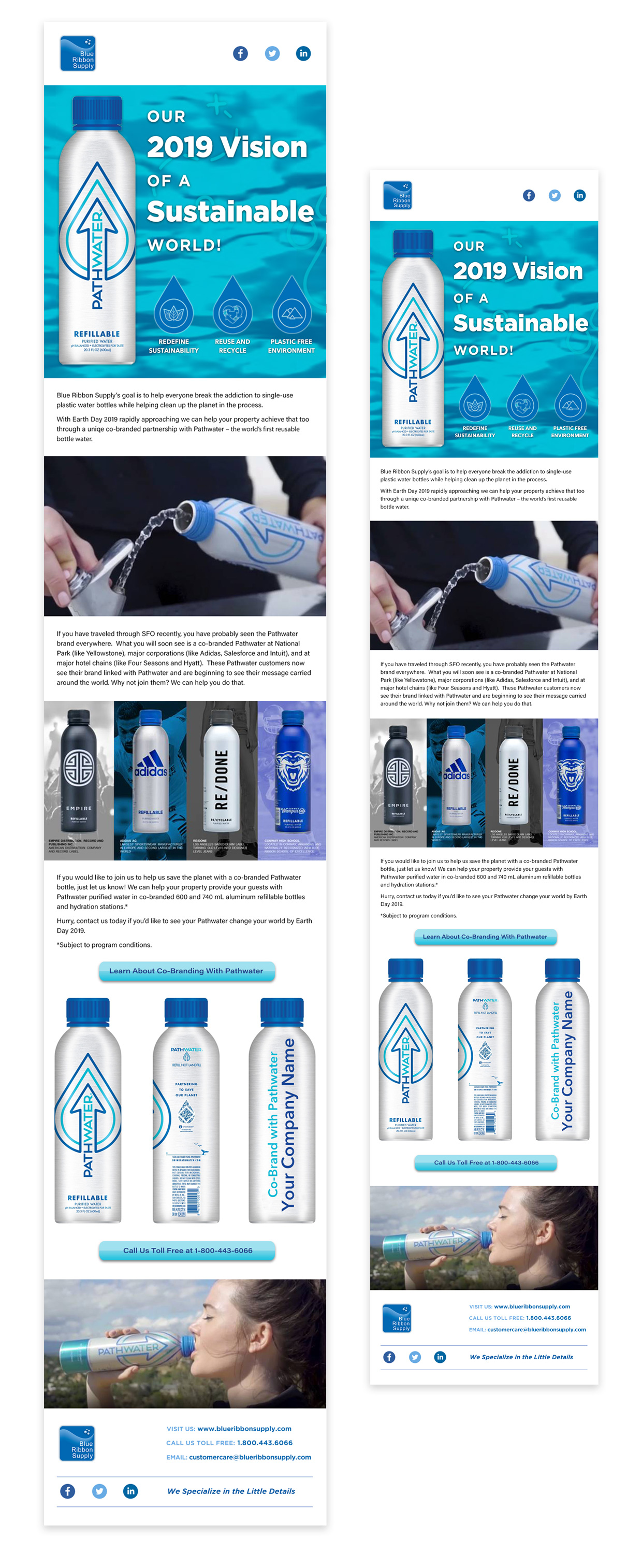 With Earth Day coming up, I worked with key members to create a responsive email campaign to offer clients in the hotel management and hospitality sector to provide their guests with Pathwater purified water with co-branded aluminum bottles and hydration stations.